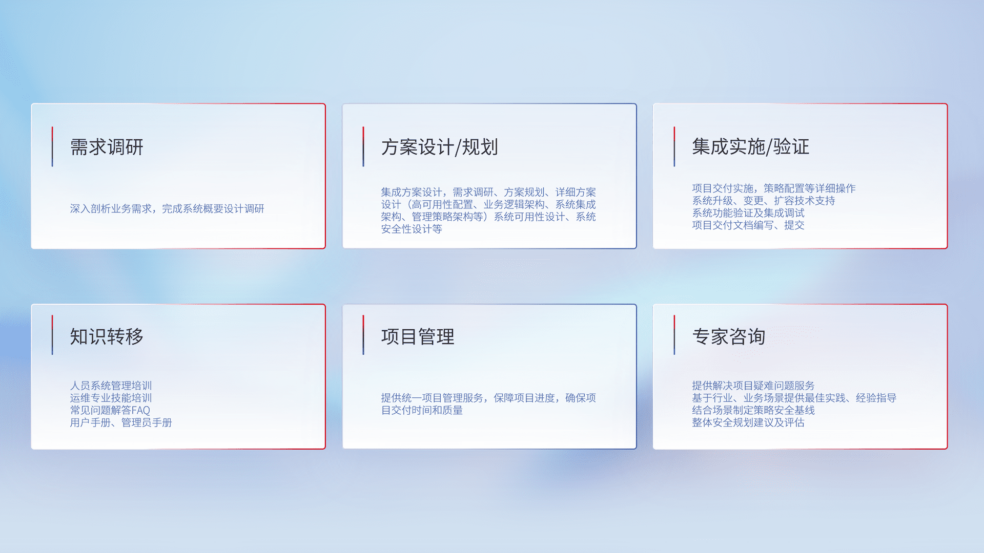 针对客户行业特性,,将宏观的安全战略和需求,,,,通过专业的交付服务,,,,实现项目落地,,为客户提供标准规范的集成交付服务。。。。